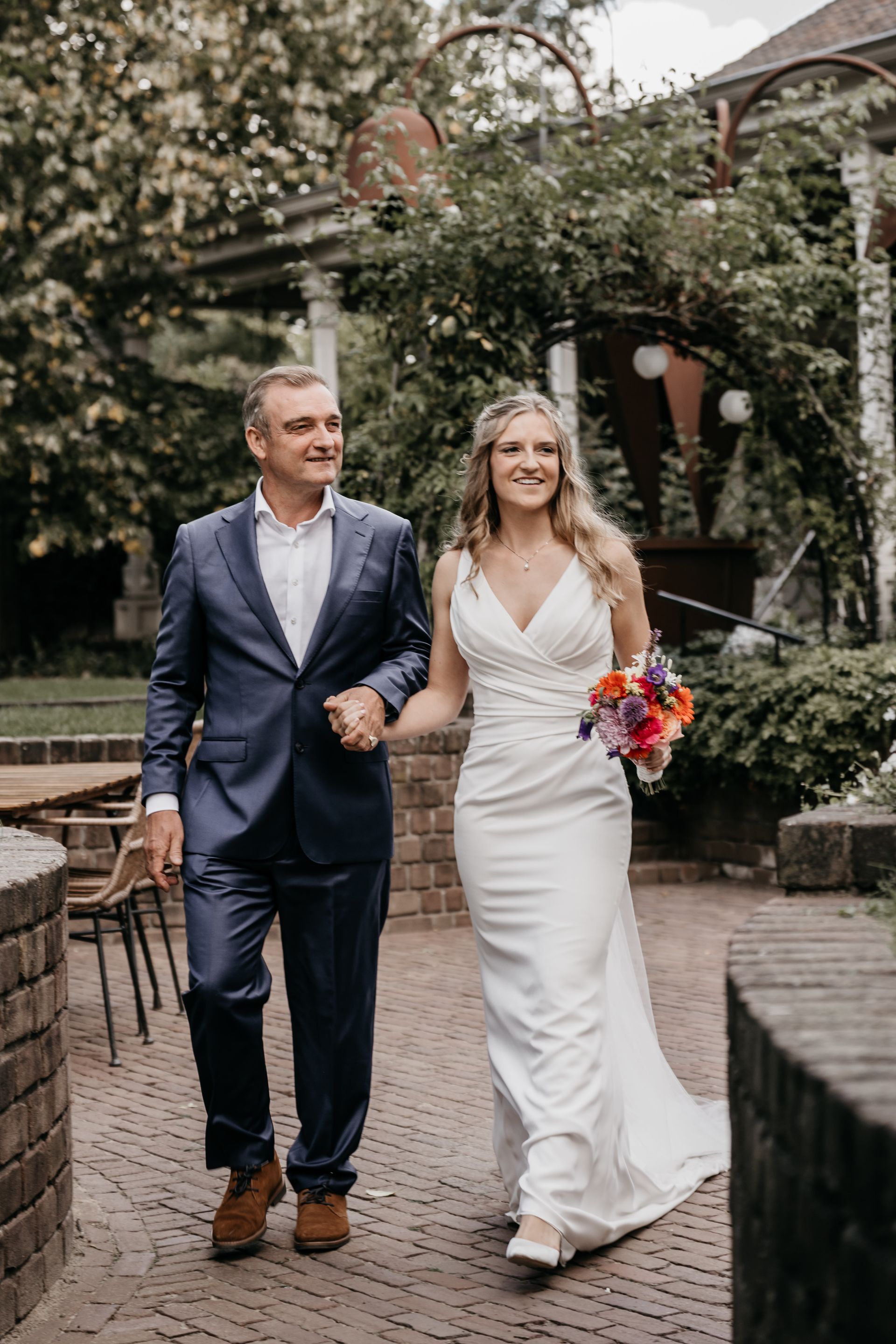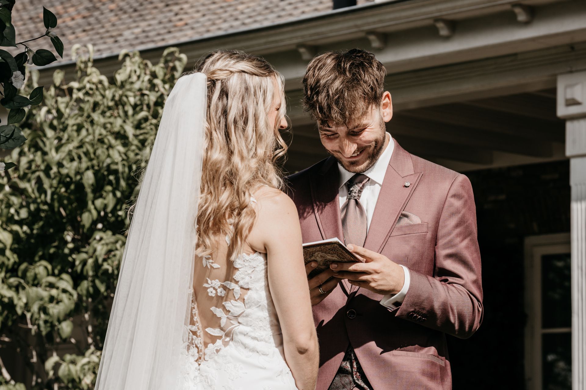 Kort erna meldde de bruidegom zich via de achtertuin. Daar vond de first look plaats: het moment dat de bruidspaar elkaar voor de eerste keer zien. Ik vind het fantastisch om de bruidegom met toch wel oplopende zenuwen te ontvangen. Ik wenste ze veel plezier. En toen... kwam Jasmijn. Wat was ze prachtig in het zonlicht. Een moment tussen hun twee, wat een ontlading. Wat een liefde. En ik mocht het vastleggen. Kippenvel als ik het zo schrijf. Het is maar een moment van 5 minuten, maar zo'n groot besef. Een besef dat je als bruidspaar hier al maanden naartoe hebt geleefd. Hoe ziet ze eruit? Welk pak zal hij dragen? En dan als je elkaar ziet, valt alles samen.