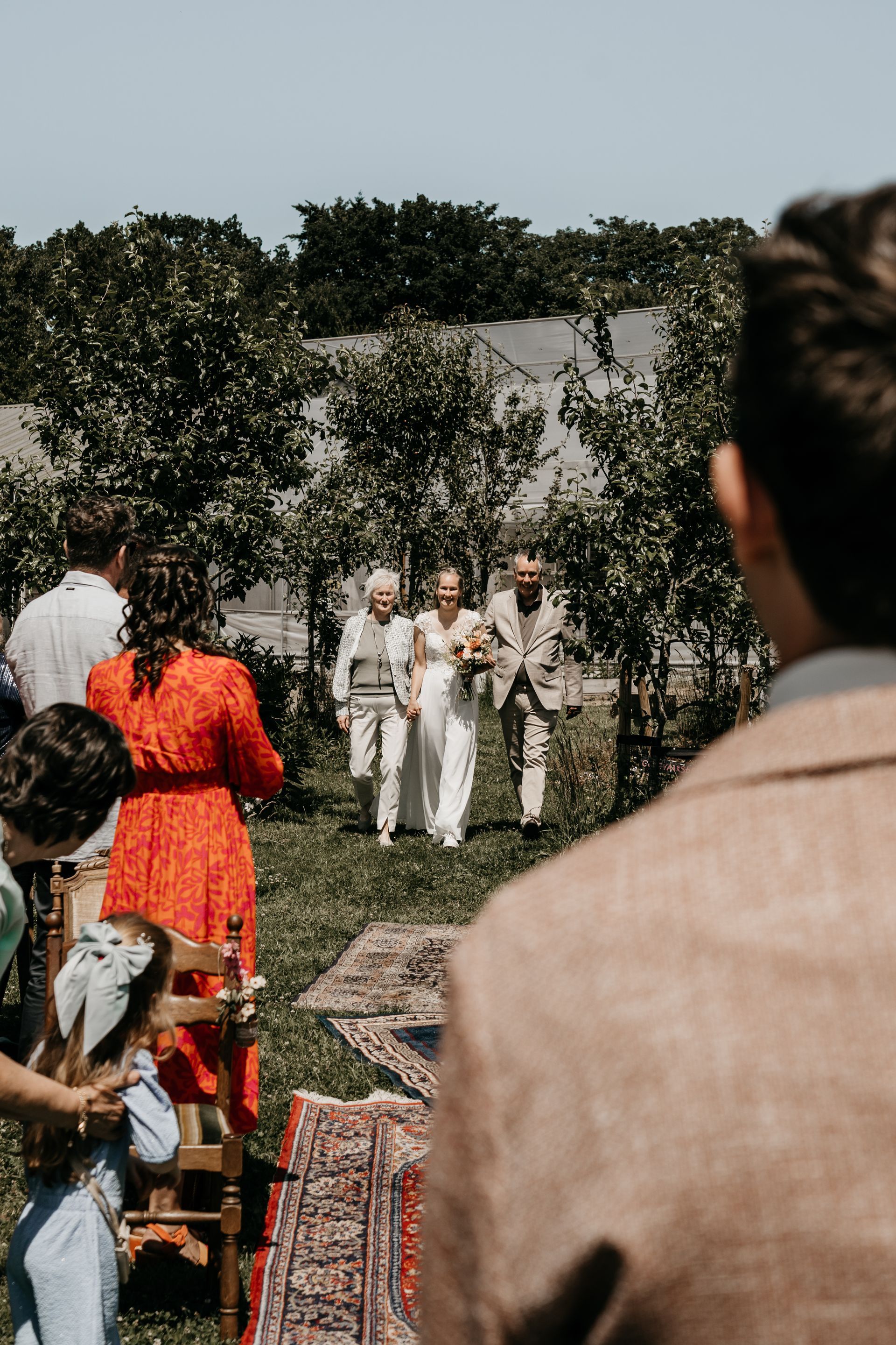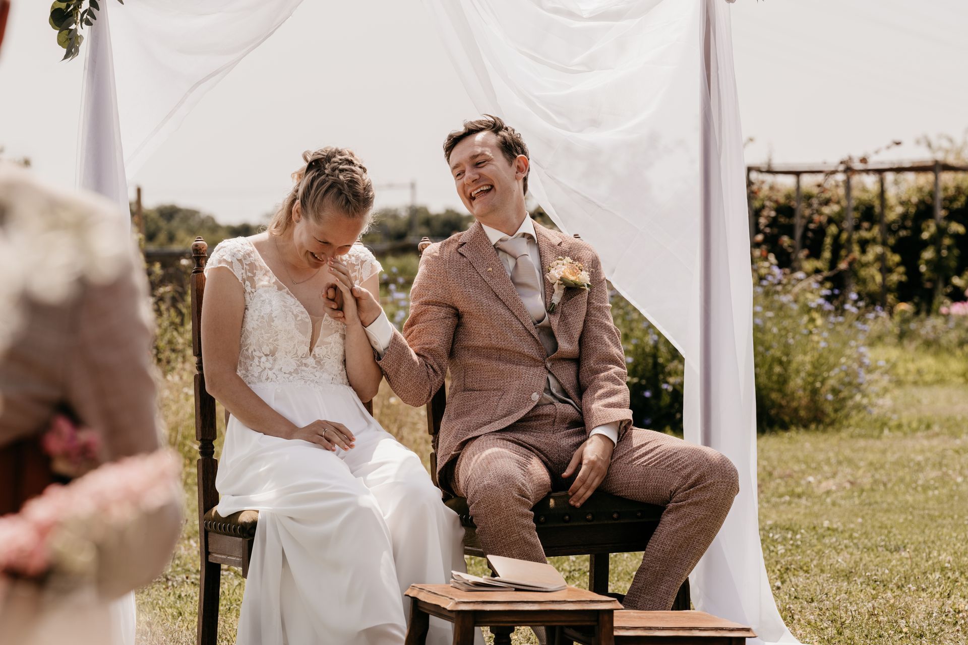Na een lunch bij De Kas van Kaat (waar de sfeer net zo ontspannen was als het bruidspaar), volgde de ceremonie in de pluktuin. Lisette werd door beide ouders weggegeven, en met een goedlachse BABS werd het een persoonlijke en luchtige ceremonie – precies zoals Remco en Lisette zijn.